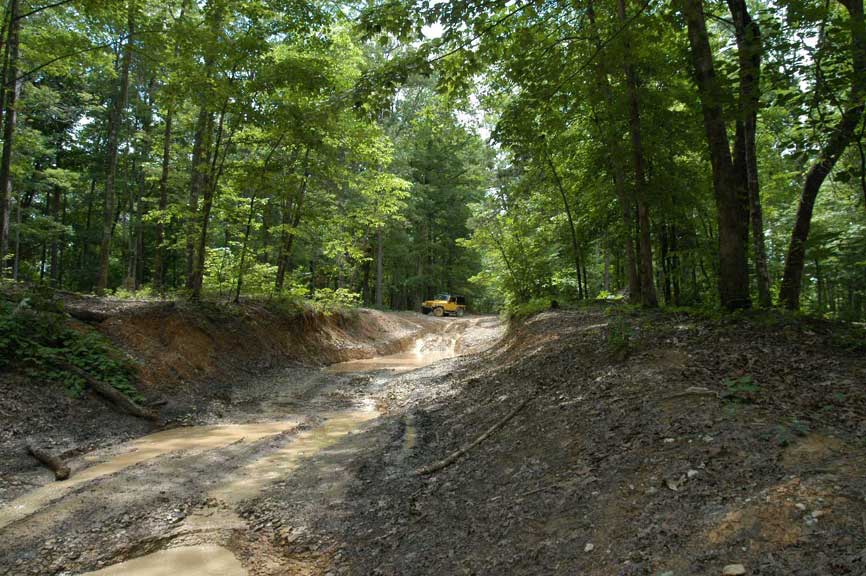 rocky terrain, washed out roads with a slick clay-like base